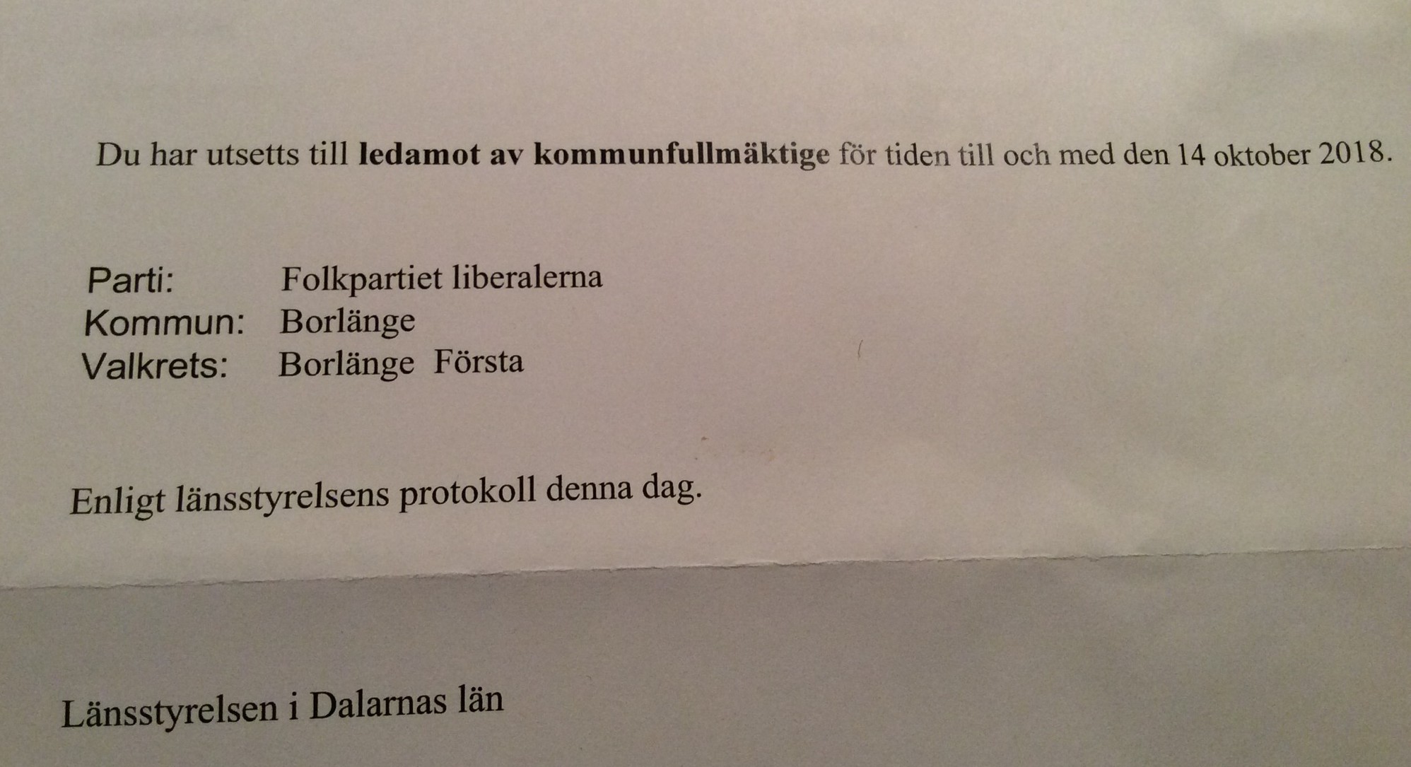 Jag har varit aktiv som kommunpolitiker i Borlänge i 10 år och suttit i kommunfullmäktige sedan 2006. I år var första gången jag blev personvald till kommunfullmäktige och då till båda Borlänges valkretsar. I Borlänge samlade jag totalt 183 kryss, vilket motsvarande ca 16 % och det är jag otroligt glad och stolt över. TACK alla som röstat och tror på mig! Jag kommer att fortsätta som gruppledare och fortsätta att driva frågor om skola, företagande och en plats för alla i socialliberal anda. Vi hade hoppats på en ökning i mandat efter allt idogt arbete de senast 4 åren men vi kan konstatera att det arbetet inte synts eller gillats av väljarna.