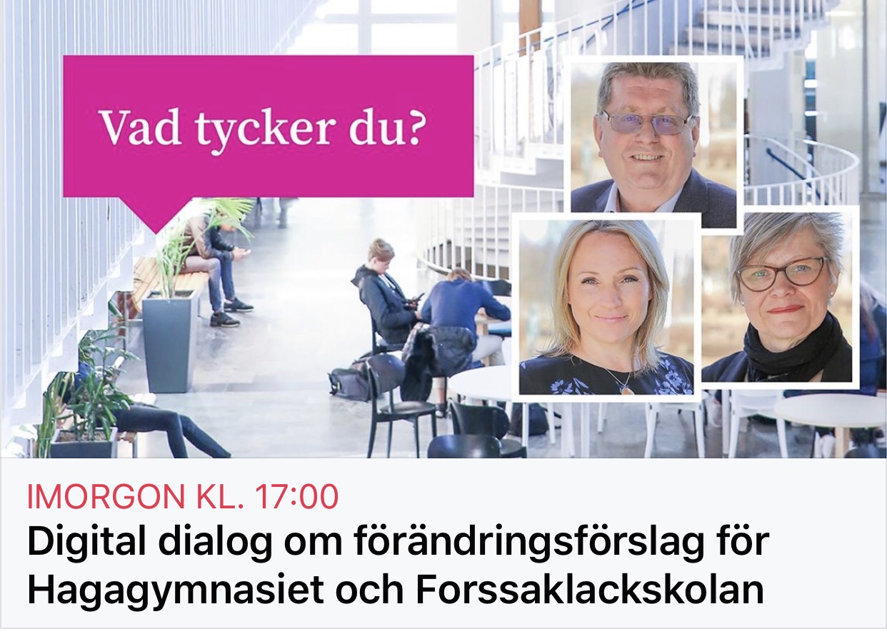 Välkommen till digital dialog om förändringsförslaget för Hagagymnasiet och Forssaklackskolan i morgon den 17 december. Vi vill höra vad du tycker.